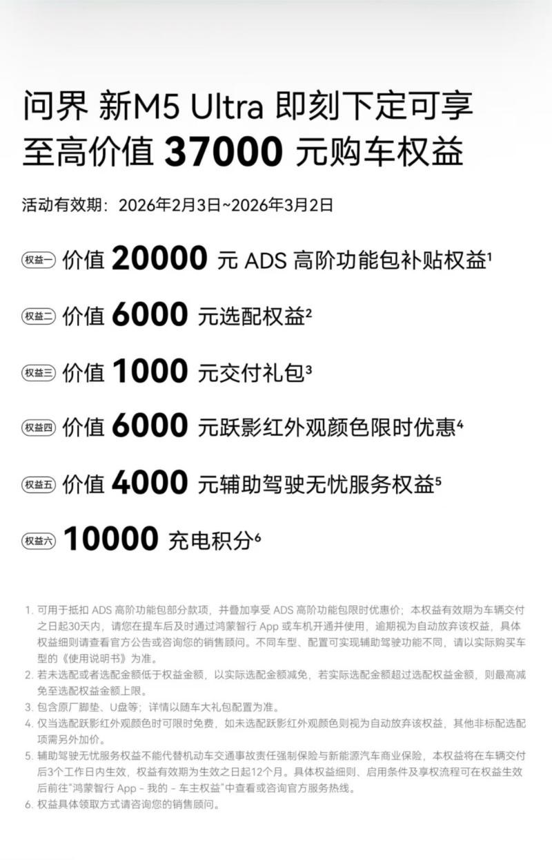 当前正值限时优惠周期,机遇难得。在2026年1月26日前下定问界新M5 Ultra,2月14就可以交付,还可锁定至高价值37000元的购车权益。这个冬天,与其被动忍受,不如主动选择。让问界新M5 Ultra用前沿科技温暖你的每一段行程,用不断进化的智慧守护每一次出行。即刻行动,把握重磅限时礼遇,开启更安全、更舒适、更高效的智慧出行新篇章。#鸿蒙智行新年OTA马上升级# #问界新M5Ultra# #陆地小坦克# #高颜出行搭子#